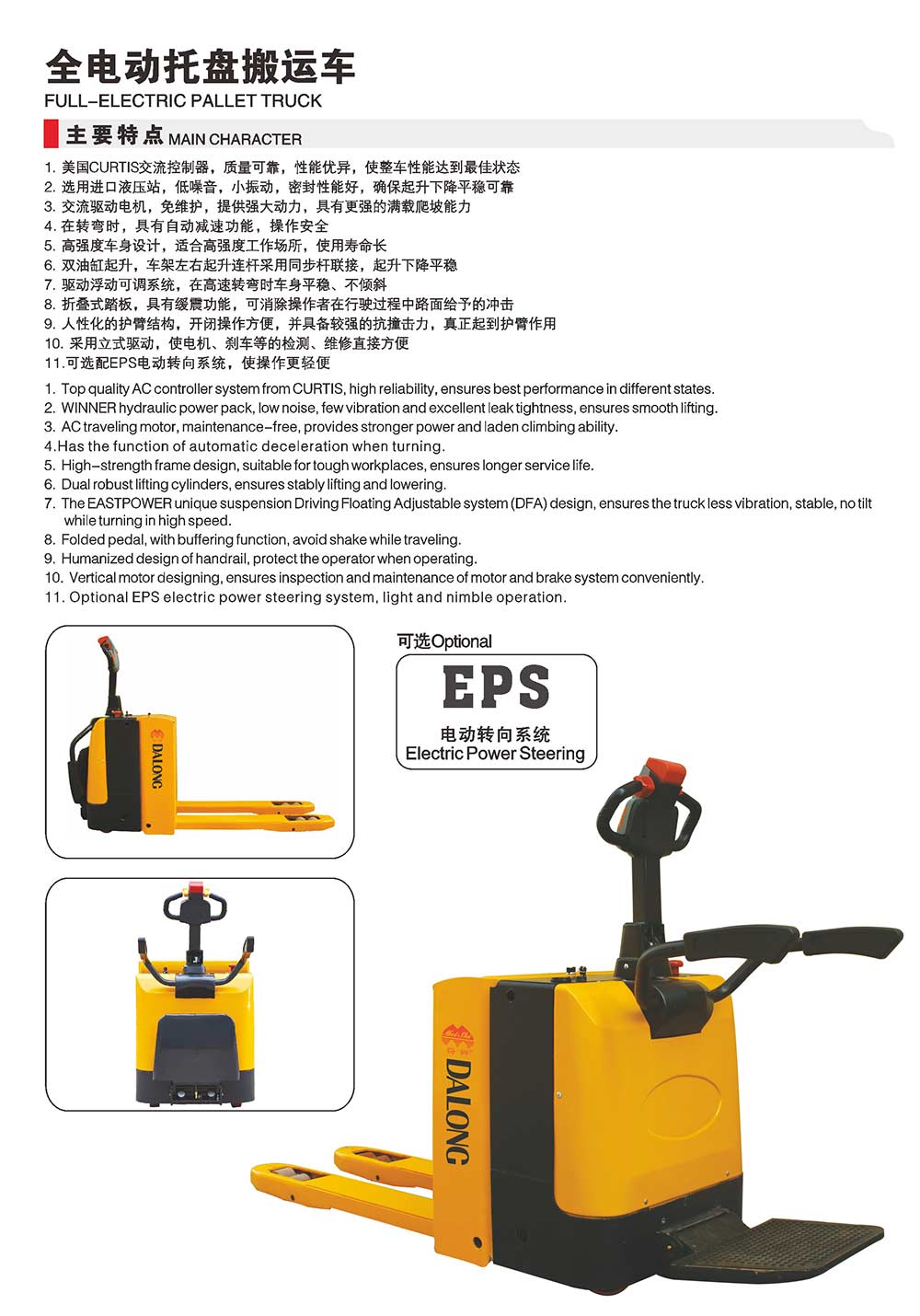 電動托盤搬運車是一種在國內(nèi)外應用廣泛且市場潛力巨大的輕小型倉儲工業(yè)車輛。它以蓄電池為動力,直流電機驅動,液壓工作站提升,操縱手柄集中控制,站立式駕駛。電動托盤車作業(yè)方便、平穩(wěn)、快捷;外型小巧、操作靈活;低噪音、低污染,能在商場、超市、倉庫、貨場、車間等場所作業(yè),尤其適合食品、紡織、印刷等輕工行業(yè)使用。